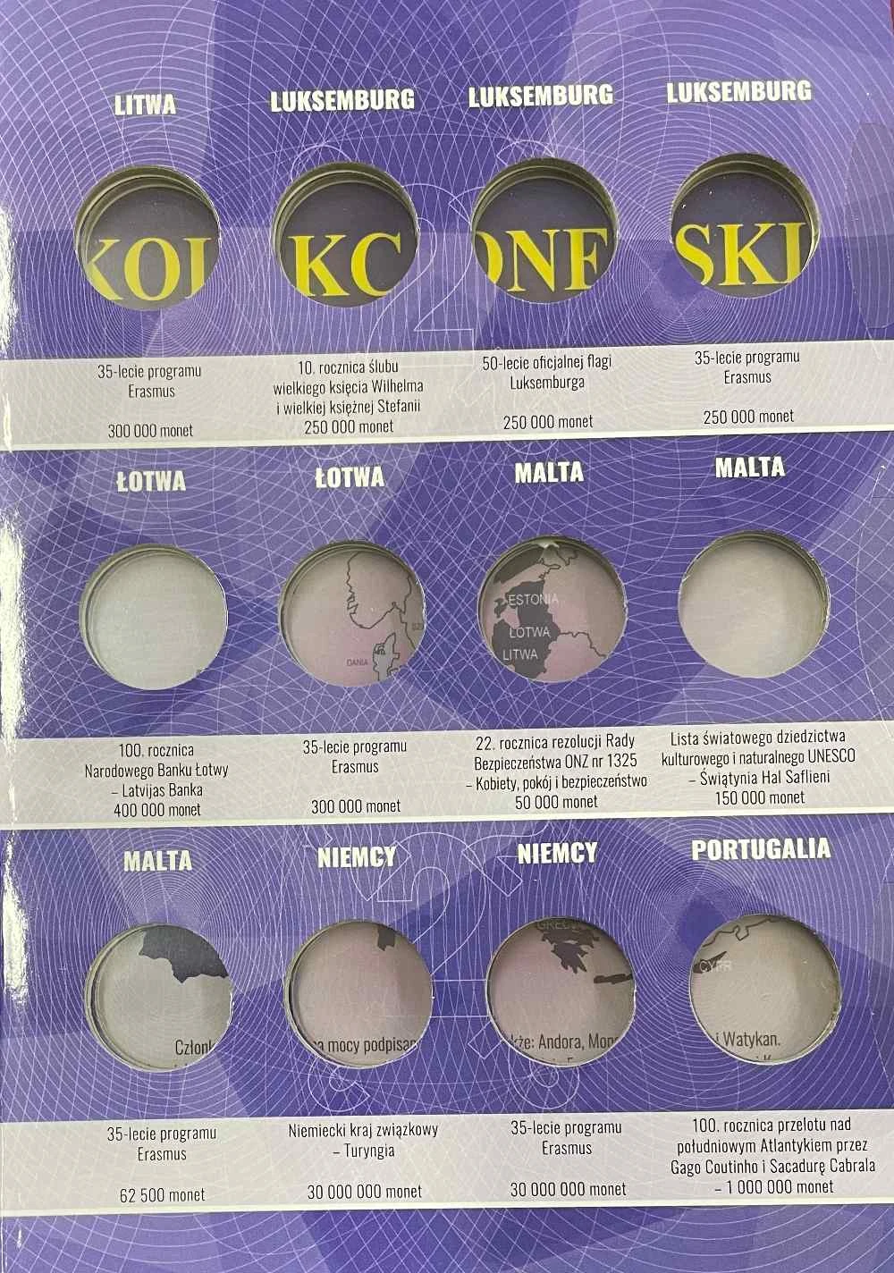 Album E-hobby na monety 2 Euro 2022 r. Tom XII przeznaczony na monety okolicznościowe o nominale 2 Euro, każda z czterech kart zawiera, miejsca na monety podpisane, zabezpieczone wysuwanymi paskami. W galerii podgląd kart oraz jakie zawierają monety.