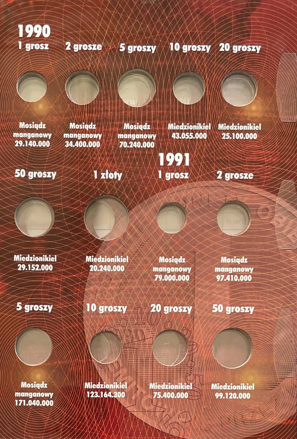 Składa się ze sztywnych 3 kart. Na każdej znajduje się miejsc na monety z opisem nakładem i materiał. Jeśli dana moneta wychodziła przez kilka lat to w albumie znajdziemy miejsce na każdy rocznik. W albumie miejsce na monety obiegowe po denominacji od 1 gr. do 5 zł. z lat 1990 do 1997 r.