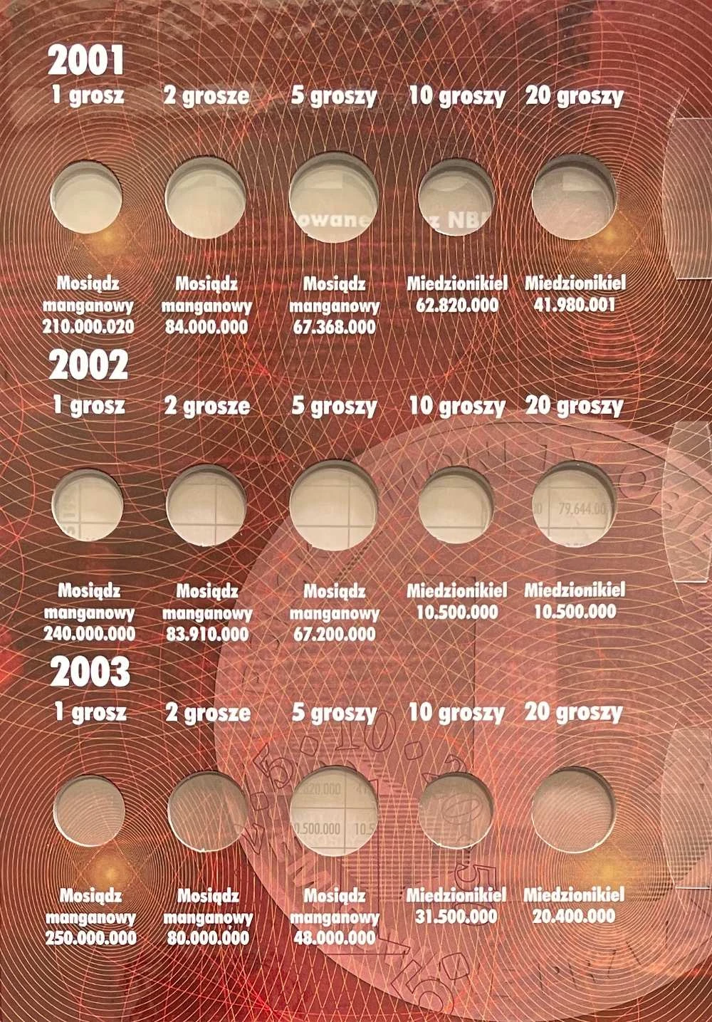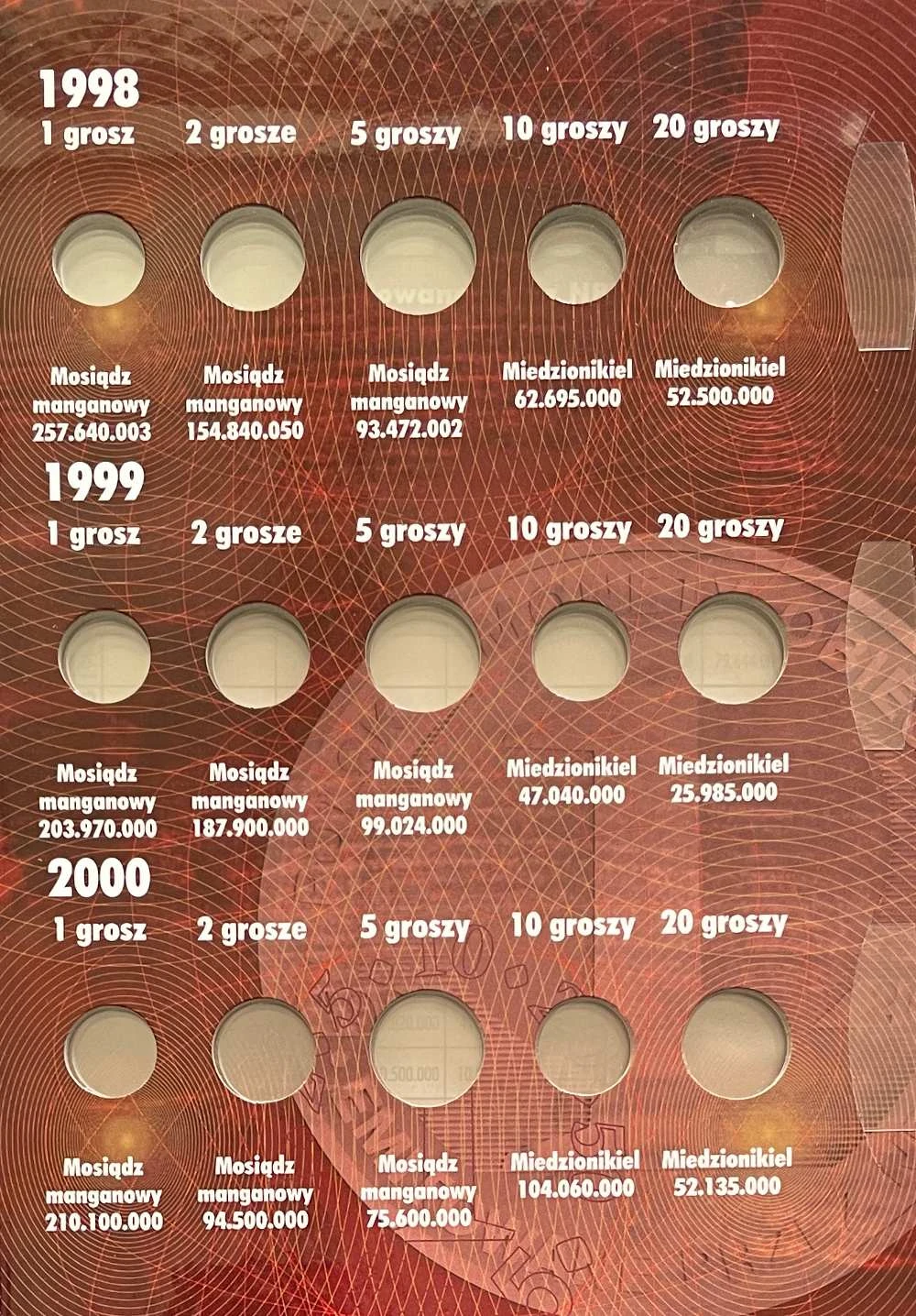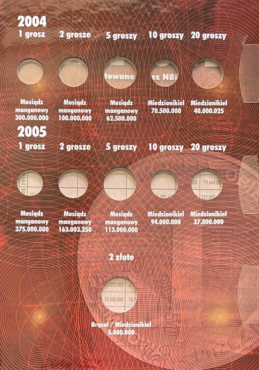 Składa się ze sztywnych 3 kart. Na każdej znajduje się miejsc na monety z opisem nakładem i materiał. Jeśli dana moneta wychodziła przez kilka lat to w albumie znajdziemy miejsce na każdy rocznik. W albumie miejsce na monety obiegowe po denominacji od 1 gr. do 5 zł. z lat 1998 do 2005 r.