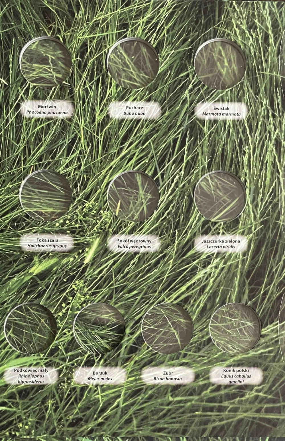 Album na monety firmy Fischer z serii Zwierzęta Świata od Jaskółki do Konika. Składa się ze sztywnych kart. Na każdej znajduje się miejsc na monety z opisem. W albumie monety są widoczne obustronnie (awers i rewers). Monety obustronnie zabezpieczone paskami foli przez co nie wypadają ani się nie poruszają. 2 karty. Wymiar albumu 24 x 18 cm.