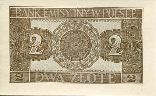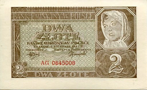 Waluta okupacyjna 2 złote z 1941 roku, wydana przez Bank Emisyjny w Polsce który został powołany w Krakowie jako nowa instytucja Generalnego Gubernatorstwa, banknot wydrukowany w Zakładach Graficznych Banku Emisyjnego w Krakowie. Awers dziewczyna w chuście, znak wodny kwadraty, seria dwuliterowa.