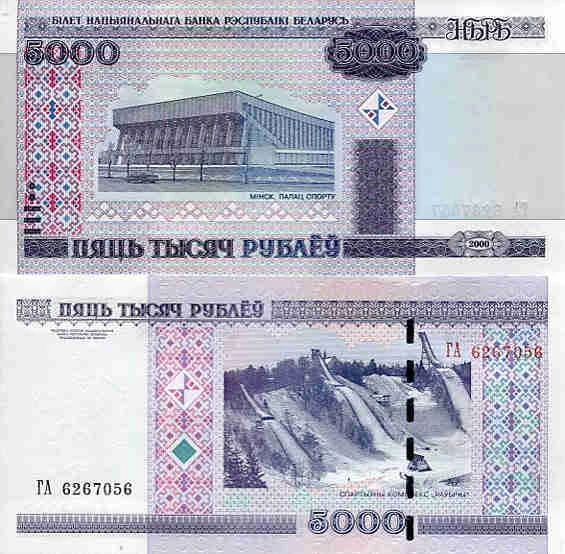 Banknot awers: Pałac Sportów w Mińsku, rewers: Olimpijski Kompleks Sportowy Raubicze