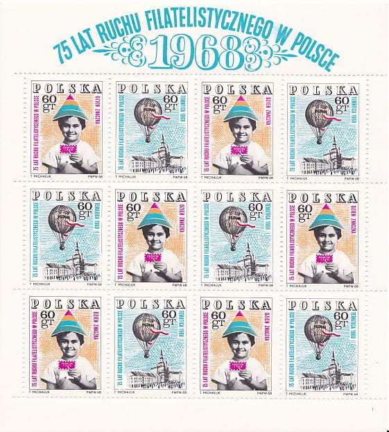 Znaczki 1968 r. 75lat ruchu filatelistycznego w Polsce. Bloczek. Czysty. Z klejem.