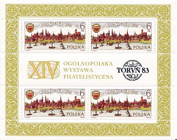 Znaczki 1983 r. 750 lecie nadania praw miejskich Toruniowi. Bloczek. Z klejem. Czysty.
