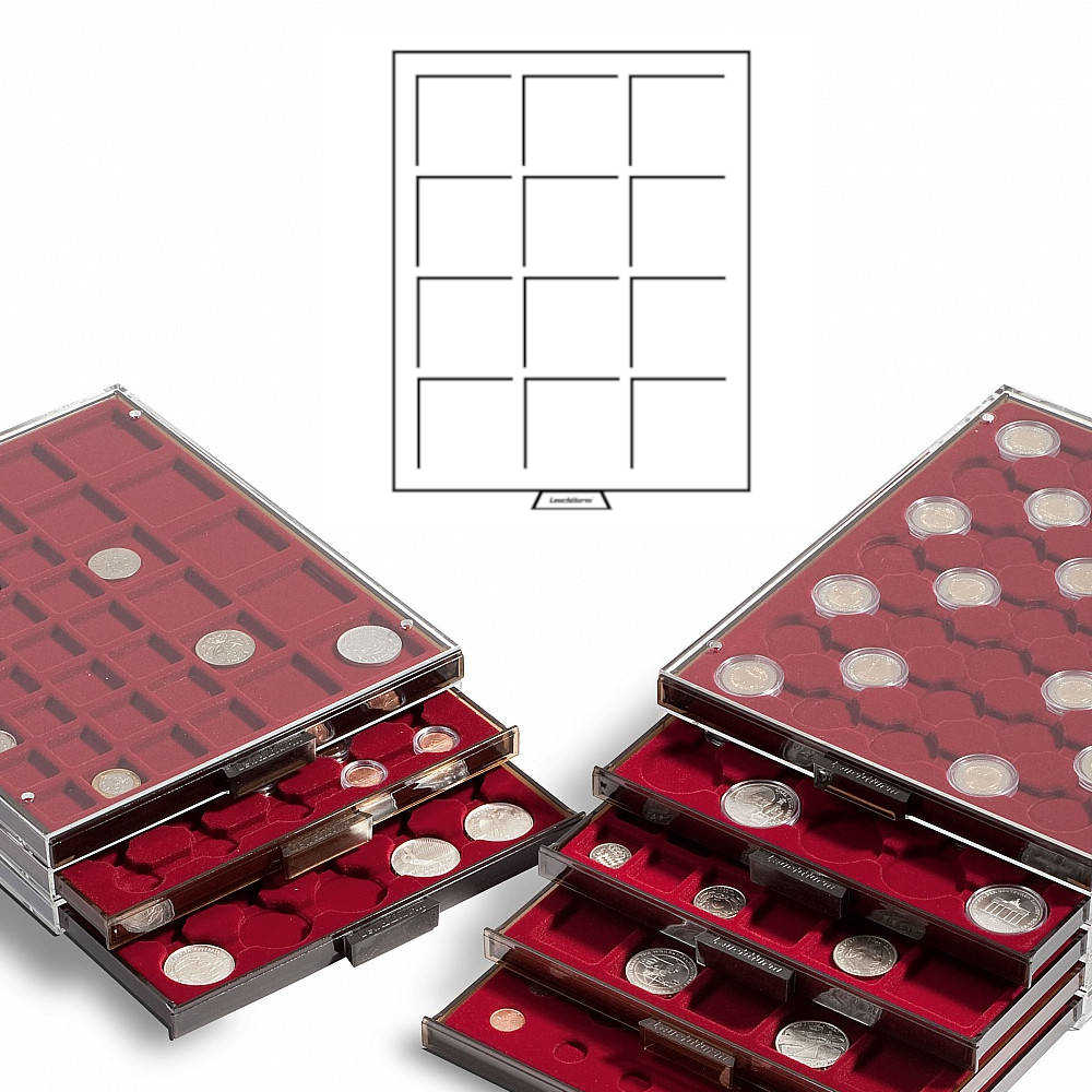 Kaseta Leuchtturm MB CAPS Szuflada ma 12 miejsc na monety QUADRUM XL lub kapsułach Grips XL 21-62 mm. Ciemnoczerwony wkład i dymiona szuflad Kasety MB doskonałe są do przechowywania w kuferkach dostępnych poniżej. Specjalny system nóżek i otworów umożliwia bezpieczne składania palet na sobie.