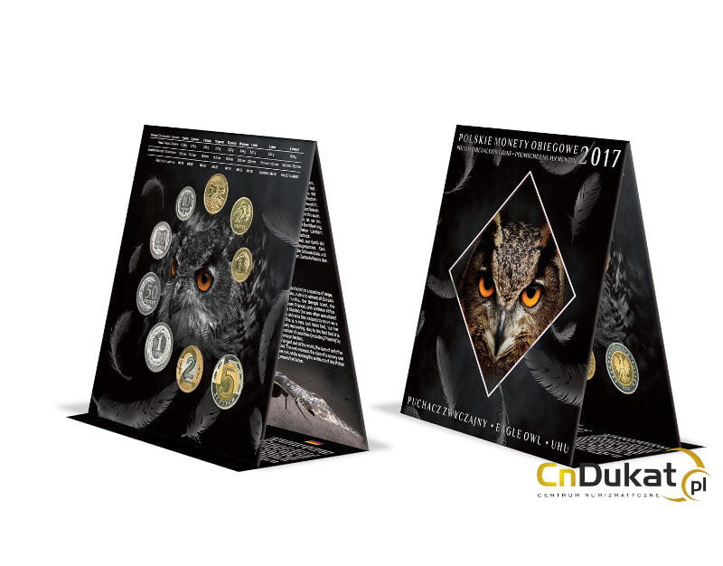 Menniczy zestaw monet obiegowych Sowa 1 gr do 5 zł z 2017 r. Eleganckie etui, monety zabezpieczone widoczne obustronnie. Wymiar etui po złożeniu 150 x 150 mm. Charakterystyka w języku polskim, niemiecki, angielskim.
