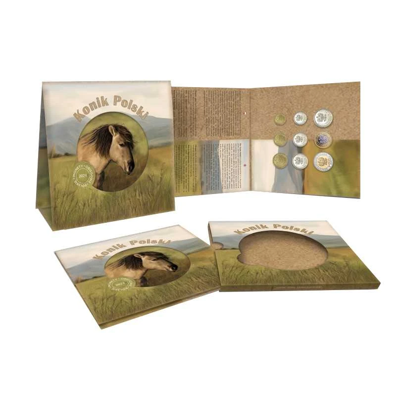 Menniczy zestaw monety obiegowe w etui 2024 r. Konik Polski, monety zabezpieczone widoczne obustronnie. Wymiar etui po złożeniu 150 x 150 mm. Charakterystyka w języku polskim, angielskim. Numerowany nakład 1000 szt.